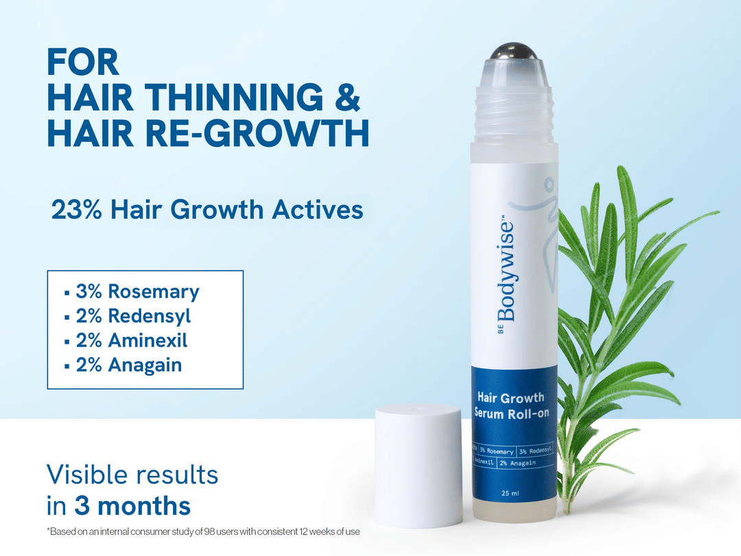 For topically treated thinning hair, a rosemary serum along with complementary actives like Redensyl and Aminexil cover multiple mechanisms at once. Be Bodywise’s Advanced Hair growth serum contains 3% Rosemary, 3% Redensyl, 2% Anagain and 2% Aminexil – a combination of supporting scalp circulation, stimulating follicles and strengthening hair protein. It is paraben-free, sulfate-free, preservative-free, with a roll-on applicator for hassle-free scalp application. The product page recommends consistent use for at least 3 months. Compare the concentrations of active ingredients and the form of administration before choosing any topical serum.